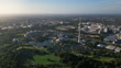 4K Aerial view Real time Footage of Munich Olympic Park or Olympiapark which was constructed for the 1972 Summer Olympics. Located in the Oberwiesenfeld neighborhood of Munich, Germany, sport complex, Tourism and Travel Destination.