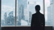 Elegante Geschäftsfrau, die durch das Fenster schaut. Stadtpanorama im Hintergrund