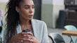 Attraktive afrikanische Geschäftsfrau, die mit beiden Händen Kaffee zum Mitnehmen hält und über etwas nachdenkt - 4K Stock-Video