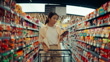 Caught in the moment, a woman examines product labels closely as she navigates through a grocery store, emphasizing the importance of making informed choices while shopping.