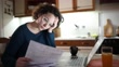 Woman going through bills, looking worried. Young brunette curly female reading her bill papers and getting headache from stress.