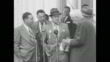 Title: "Bob Hope Honored By President" superimposed over CU comedian Bob Hope / CU Hope entering White House / INT Hope with Pres. Harry S. Truman, cameramen in background / Hope and Truman holding a framed scroll / Tilt up scroll / MS photographers taking photos / CU Truman and Hope look at scroll and shake hands / CU Bob Hope coming out of White House / WS Hope and reporters in front of microphone / Hope being asked: "Did you discuss politics, Mr. Hope?" / Hope SOT: "Very little, very little." / Reporter: "Well, how little?" / Hope: ""Well, the President is now preparing for his next whistle stop and I tried to get him to take Jane Russell on the train. I though that might help" / PAN cameramen / CU Hope continuing SOT: "He will get some of the bigger whistles," laughing / Hope being asked: "You and Crosby both neutral in this campaign? / SOT Hope answers: "Well, I imagine, I imagine, old [unintelligible] is neutral because I remember one time he came out for John Quincy Adams and got in deep trouble"