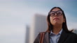Geschäftsfrau mit Smart Glasses und fragt nach dem Weg zum Augmented Reality Metaverse Interaktivitätsraum - 4K Stock-Video