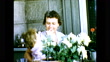 Actors sitting around the table talking to each other under a tent, woman smiling with children in Marfa, Texas 1950s