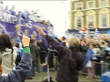 GVs cheering Chelsea fans outside stadium with flags / open top bus arriving at stadium with players Frank Lampard, John Terry and others, and Jose Mourinho (Chelsea Manager) / buses along past fans / GVs fans / bus along with players Eidur Gudjohnsen and Arjen Robben