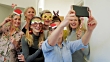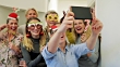 Eine Gruppe von Büroangestellten feiert Weihnachten zusammen und macht ein Selfie.