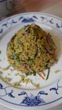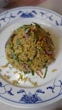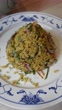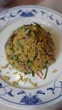 Table top view of a plate of Nyonya cuisine in Penang, Malaysia known as Nasi Ulam - Nyonya herb rice with salted fish flakes, dried prawns and aromatic herbs