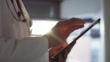 Männlicher Arzt, der ein digitales Tablet hält und benutzt, arbeitet in einem modernen Krankenhaus. Nahaufnahme eines Chirurgen, der online surft, um in einer Klinik über Technologie zu recherchieren. Mann, der seinen Zeitplan überprüft