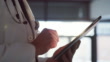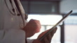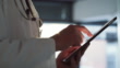 Nahaufnahme eines Arztes, der ein digitales Tablet hält und verwendet, das in einem modernen Krankenhaus arbeitet. Ein Chirurg, der online surft und über Technologie recherchiert, während er in einer Klinik steht. Mann, der seinen Zeitplan überprüft - 4K Stock-Video