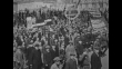 Crowd in street of Russian city / Russian Orthodox priests lead a procession as Czar Nicholas II, Czarina Alexandra Feodorovna, and their son Czarevich Alexei Nikolaevich follow; Alexandra nods her head in acknowledgment of crowds lining the procession route; daughters Grand Duchesses Olga Nikolaevna, Marie Nikolaevna, Tatiana Nikolaevna, and Anastasia Nikolaevna follow, escorted by officers; event is a celebration of the tercentenary of the Romanov dynasty / Russians march in streets of city (possibly Petersburg) / still Bolshevik leader Vladimir Lenin / Note: exact month/day not known