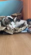 Contentment and curiosity radiate from this sweet, white tabby cat, nestled comfortably within a crinkled wrapping paper bed, perfect for cozy lifestyle imagery.