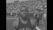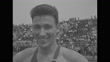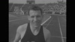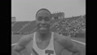 CUs track and field stars in stadium with grandstands behind them, Georgetown's Alfred Blozis, shot-put winner; New York University's Leslie MacMitchell, mile race winner; Tuft's Edward Dugger Jr, high hurdle winner; Penn State's Barney Ewell, winner of 100 yard sprint; talking to reporter then shot of him alone; Notre Dame's Gregory Rice, two mile run winner; and Pitt University's hurdler Harold Stickel / Note: exact month/day not known