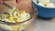 Shown here are different stages of preparing eggs to make salad. The eggs are shown here cut up in a bowl