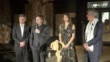 Emma Raducanu, accompanied by (right to left) Michael Ward, Managing Director of Harrods, Pietro Beccari, Chairman & CEO of Christian Dior, and (unknown), hits the power on the Dior winter presentation at Harrods Department Store. Not everything goes to plan, with some technical issues.