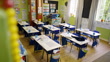 Leeres Klassenzimmer oder Draufsicht auf das Schulgebäude für den Unterricht mit Schreibtisch oder Stühlen für den Morgenunterricht. Grundschule, Ausstattung und Mobiliar zum Lernen, Lehren und Raum für das Studium des Wissens - 4K Stock-Video