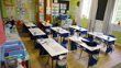 Empty, classroom or top view of school building for education with desk or chairs for morning class. Primary, equipment and furniture for learning, teaching and room for students to study knowledge