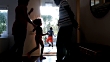 Der Mann öffnet die Tür und zwei Kinder rennen mit ihrer Mutter durch, der Junge rennt zurück ins Haus und kommt dann wieder heraus, während die Familie auf ihn wartet.