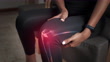 Footage close-up of Woman suffering from pain in the knee while sitting on the couch. VFX joint and knee pain augmented reality animation. Health care and medical concepts.