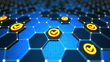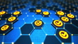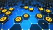 Futuristic digital background with hexagonal elements, yellow glowing check mark and binary code. Digital voting security. Big data safe. Seamless loop 3d animation.