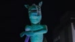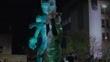 A wide nighttime tracking shot moves steadily along a Halloween parade in Derry, lit by cool streetlights and shifting colored spotlights, revealing a towering illuminated creature float surrounded by dancing performers whose costumes blur with their energetic motion, while the camera holds a slightly low angle to emphasize scale against the dark sky and nearby modern buildingsLondonderry, Northern Ireland, UK - October 31, 2025