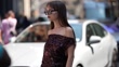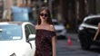 NEW YORK, NEW YORK - SEPTEMBER 13: (SLOW-MO) A guest wears long straight brown hair with blunt bangs, black cat-eye sunglasses, a thin silver chain necklace, an off-the-shoulder, floor-length dark burgundy sequin gown with a fitted silhouette, gathered waist and a high left thigh slit revealing the leg, black knee-high leather boots with lug soles and a low block heel, outside Lapointe, during New York Fashion Week, on September 13, 2025 in New York City. (Footage by Edward Berthelot/Getty Images)