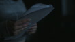 The hands on an unrecognizable figure hold a screenplay on a spotlit stage