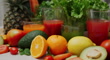 Footage dolly shot, Fresh fruits, vegetables and colorful juices are arranged together. red, green and orange juice glasses are surrounded by ingredients such as lemon, orange, avocado, carrot, tomato, mint, ginger, banana, lettuce and pineapple.