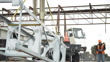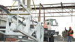 An Hispanic man in his 50s working at a construction site, standing on the ground, giving directions to a crane operator, hoisting a large object. The crane operator, in the cab in the background, stands up and is visible for a moment toward the end of the clip. He is a senior man in his 60s.