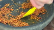 A home cook uses a mortar and pestle to grind peanuts and chilli into a satay sauce for use in traditional Indonesian cooking. Close up, high angle.