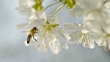 Slow motion close up locked down shot of a Carniolan honey bee collecting pollen on a white blossom of a cherry tree. Shot in Slovenia.