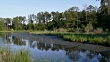Tall grass reeds and pines stand in tidal marsh mudflats on Jamestown Island as bald cyprus trees wade along the Sandy Bay of James River, both in the Colonial National Historic Park in Virginia near the historic Jamestown Settlement.