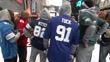 Justin Tuck and team at Nike Brings Broadway Bowl Football Matchup To The Heart of Times Square on 4/28/2012 in New York, NY, United States. (Footage by WireImage Video/Getty Images Entertainment Video).