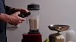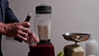 Man making white gazpacho at home. He opens a new bottle of sherry vinegar, then adds it to the blender.Ajo blanco is the predecessor of red gazpacho. The dish of Spanish origin is originally made of: almonds, white bread and ice-water and seasoned with olive oil, garlic, sherry vinegar, salt and pepper and served cold with muscat grapes, toasted almond shavings and drips of olive oil.