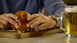 Slow motion close-up video of male hands taking juicy burger. Also visible in shot is mug of draft beer. Video shot with camera Red Raven 4K.