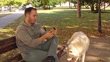 Man using phone and petting his dog in park