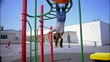 Medium shot boy hanging upside down on monkey bars and smiling / girl hanging upside down in background - HD Stock-Video