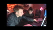 Medium shot of Damon Albarn and Alex James of 90s Britpop band Blur working on computers, they are composing music to send to Mars (BBC News, 030-02-27EC – 30/01/2002 – AEXZ288W)
