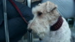 Close up of Wire Fox Terrier at an outdoor cafe in London, England.