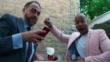 Mixed race homosexual couple sitting at a table at an outdoor cafe, having lunch in London, England.