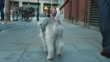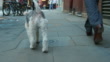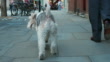 Man wearing grey suit walking down street with Wire Fox Terrier in London, England.