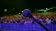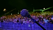 Locked down close up shot of a microphone on the stage and audience waiting for performer.