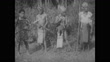 Sequence showing Murut tribespeople living together in the forests of rural Sarawak, Malaysia; 1963. WS tribesmen in traditional clothing carry spears. MS young boys carry spears. MS older Murut tribeswoman in headdress. WS four tribesmen wearing traditional clothing and carrying spears. CU tools on belt. (LCA6924X - AEVZ001J)