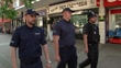 Two Polish police officers patrolling shopping street with British police officer (following recent attacks on Polish residents)