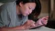 Eine erwachsene Frau liegt beim Spielen von Handyspielen auf dem Bett.