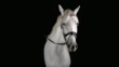 Slow motion medium locked down shot of a white horse on black background turning it's head and looking into the camera.
