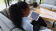 Black female real estate developer checking a blueprint and a property information while sitting on the couch at home - Real estate concepts