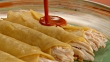 CU PAN red tomato sauce poured across row of chicken enchiladas - HD Stock-Video