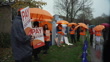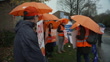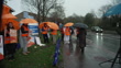 Resident doctors strikes: picket line in Oxford; ENGLAND: Oxfordshire: Oxford: John Radcliffe Hospital: EXT / RAINVarious shots of picket line outside hospital, people holding orange 'Pay Restoration for Doctors' signs and orange umbrellas and chanting /