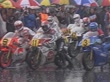 NORTHAMPTON, ENGLAND - AUGUST 3: (COMPILATION) Riders wait on the grid in heavy rain, with Wayne Gardner on pole position on his Rothmans Honda NSR500; Manfred Fischer takes the lead on his Hein Gericke Honda RS500, before we see part of the first lap including onboard footage from Roger Burnett’s Honda Britain NS500 at the British Motorcycle Grand Prix at Silverstone Circuit on August 3, 1986 in Northampton, England. (Footage by Duke Video/Getty Images)