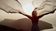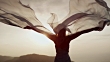 Young woman in long summer dress flying in the wind standing on a rocky shore
